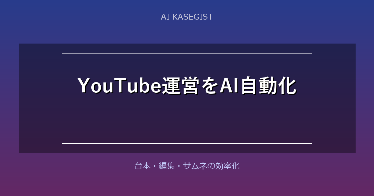 YouTubeチャンネルの運営には、企画・台本作成・撮影・編集・サムネイル作成・投稿設定・分析など多くの工程があります。このうち、AIで自動化・効率化できる作業は想像以上に多いです。
